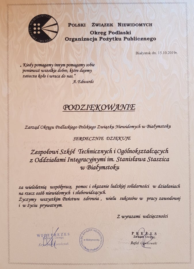 15 października obchodziliśmy Święto Białej Laski – Międzynarodowy Dzień Niewidomych. Ta coroczna impreza odbyła się na Rynku Kościuszki, gdzie wszyscy uczestnicy mogli doświadczyć i przekonać się z jakimi problemami borykają się osoby niewidome. Nasi uczniowie też tam byli razem z Panią Barbarą Gierej i Panem Tomaszem Kalinowskim.